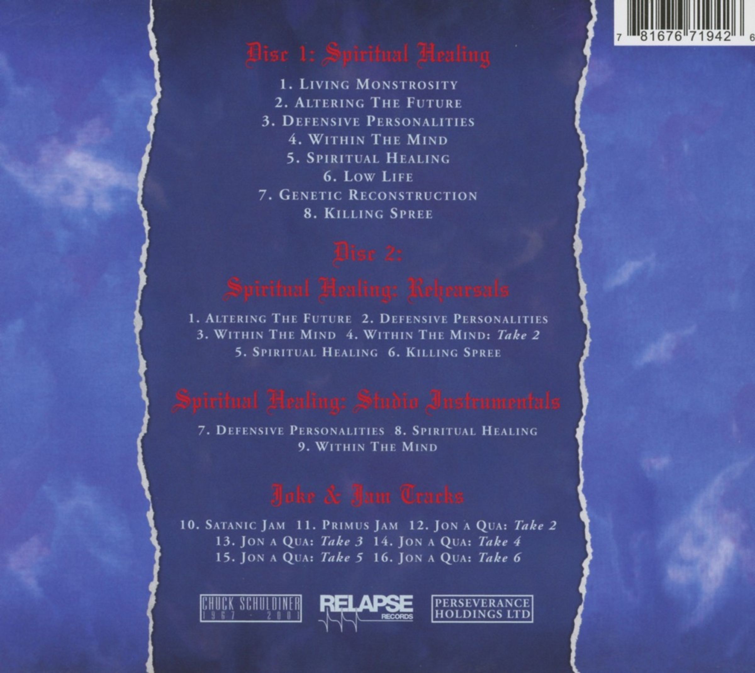 Now reissued as a double CD housed in super deluxe packaging featuring brand new liner notes from DEATH players James Murphy and Terry Butler, Chuck’s sister Beth Schuldiner and Michael Poulsen (Volbeat), Disc 1 features a completely new remaster of the original album and Disc 2 contains 16 previously unreleased rehearsal, outtakes and studio instrumentals.