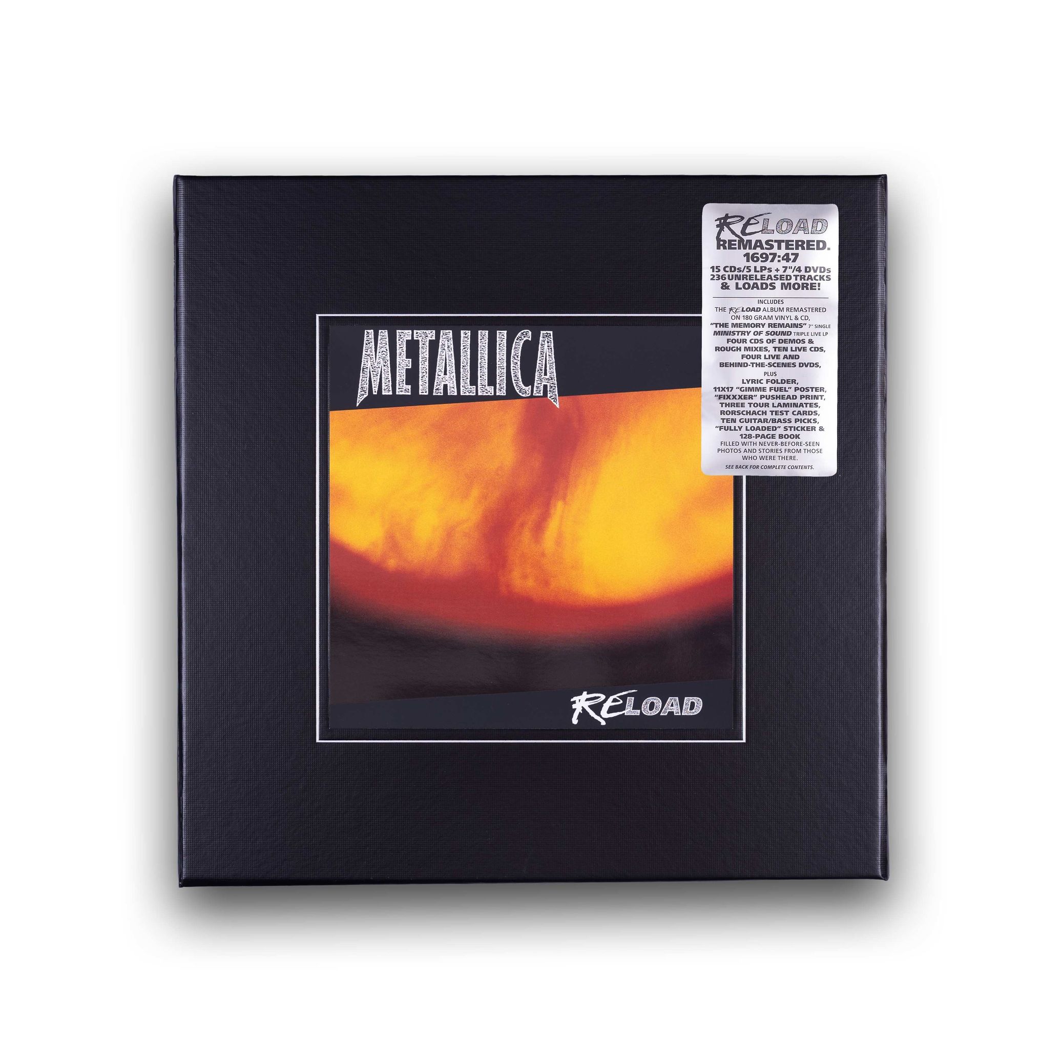 The limited deluxe box (with magnetic closure) of “ReLoad (2025 Remastered)” contains the album remastered on 180-gram double LP, the 7″ picture disc “The Memory Remains”, three live LPs, 15 CDs and four DVDs with unreleased material (live performances, rough mixes, demos, etc.), an MP3 download card with live performances, rough mixes, demos, etc.), an MP3 download card with all audio files, three tour laminates, an 11×17-inch Gimme Fuel poster, a Pushead print, a sticker, 10 guitar/bass picks, a set of 13 Rorschach test cards, a folder with lyrics and song sheets as well as a 128-page hardcover book with previously unpublished photos + stories from contemporary witnesses.
